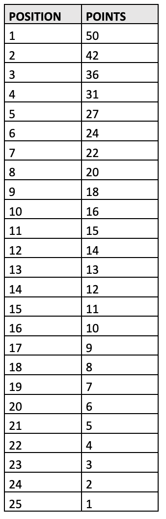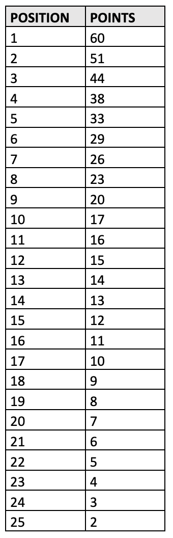 Only finishers are eligible for points based on official race results. Two scoring scales are used depending on the event.